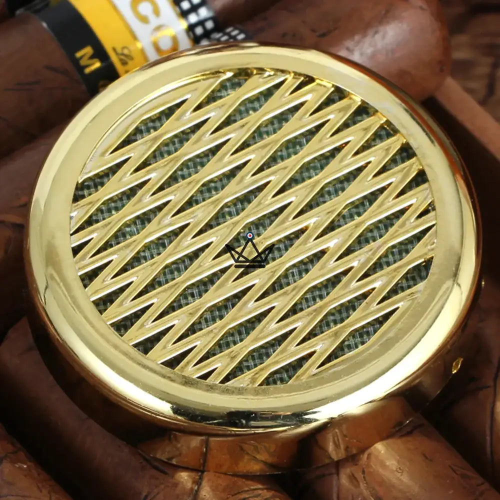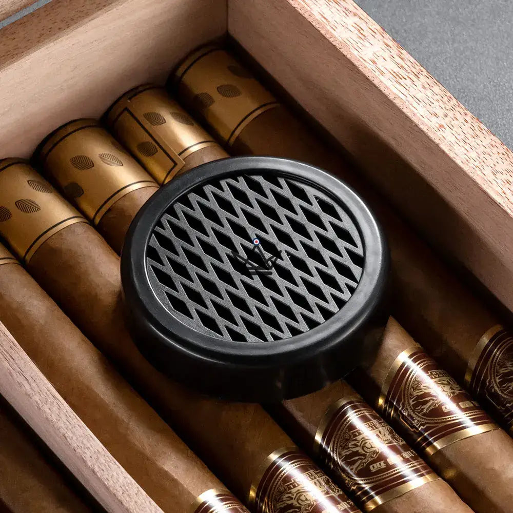 Available in three elegant finishes: Gold , Silver , and Black , the ROUND T75 fits any humidor aesthetic. Made with high-quality materials, including PVC and polymer sponge, it provides long-lasting and uniform humidification to preserve the quality and freshness of your cigars for extended periods of time.