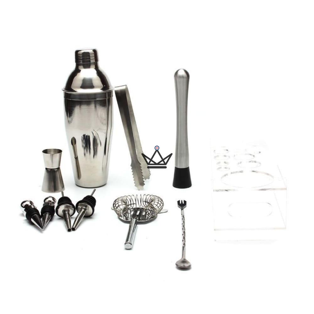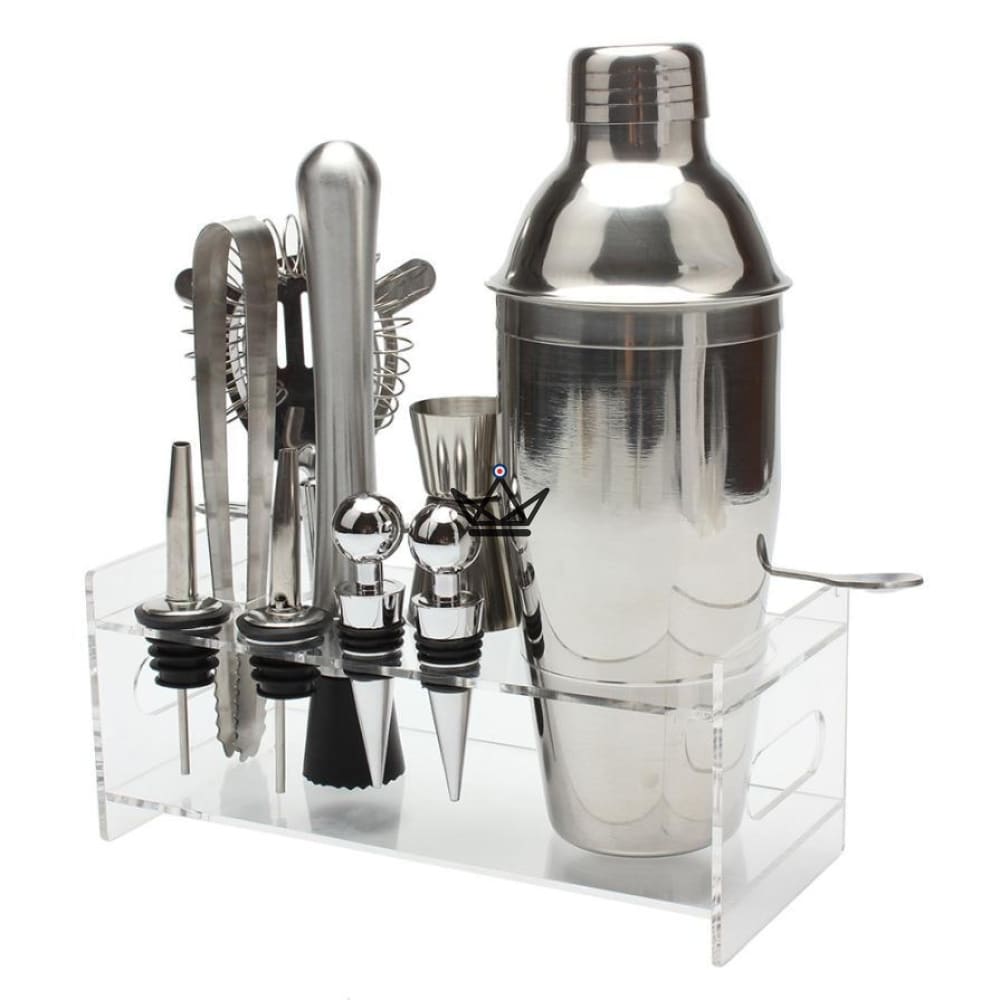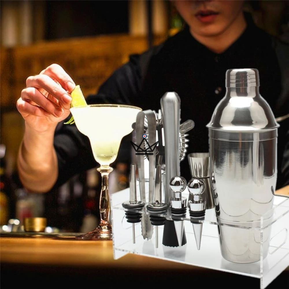 This complete bartender kit will allow you to make professional cocktails at home, whether to impress your guests at parties or to treat yourself with your own creations. The combination of quality accessories and the acrylic stand will add a touch of elegance to your bar or kitchen.
