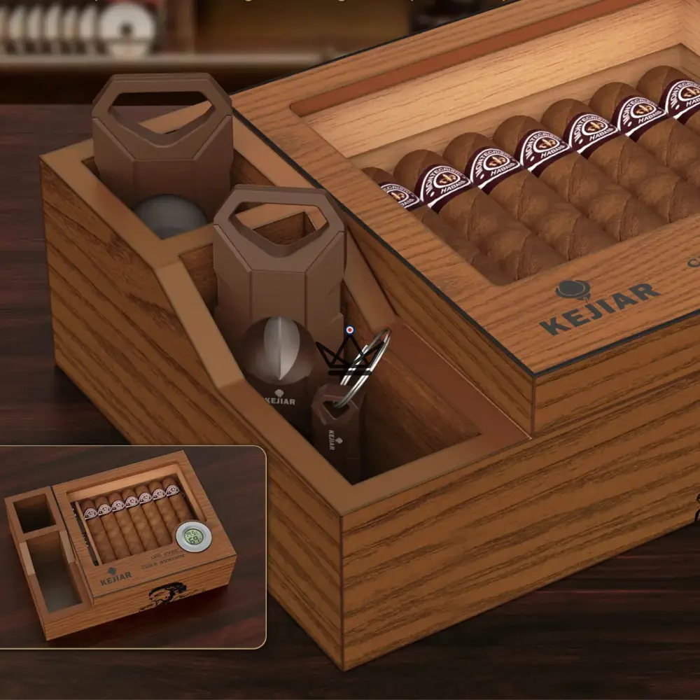 Ausgestattet mit einem Glasdeckel ermöglicht es Ihnen, Ihre Zigarren sofort zu betrachten, während gleichzeitig eine perfekte Abdichtung gewährleistet ist. Sein integriertes digitales Hygrometer garantiert eine präzise Kontrolle der Luftfeuchtigkeit, während sein einstellbarer Gel-Luftbefeuchter es Ihnen ermöglicht, Ihre Zigarren in einer idealen Atmosphäre zwischen 65 % und 72 % zu halten.