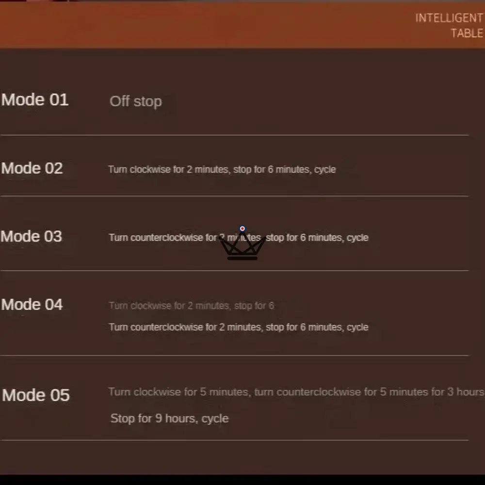 Modus 5: 5 Minuten lang im Uhrzeigersinn drehen, dann 3 Stunden lang 5 Minuten lang gegen den Uhrzeigersinn drehen, 9 Stunden lang ausschalten, Zyklus