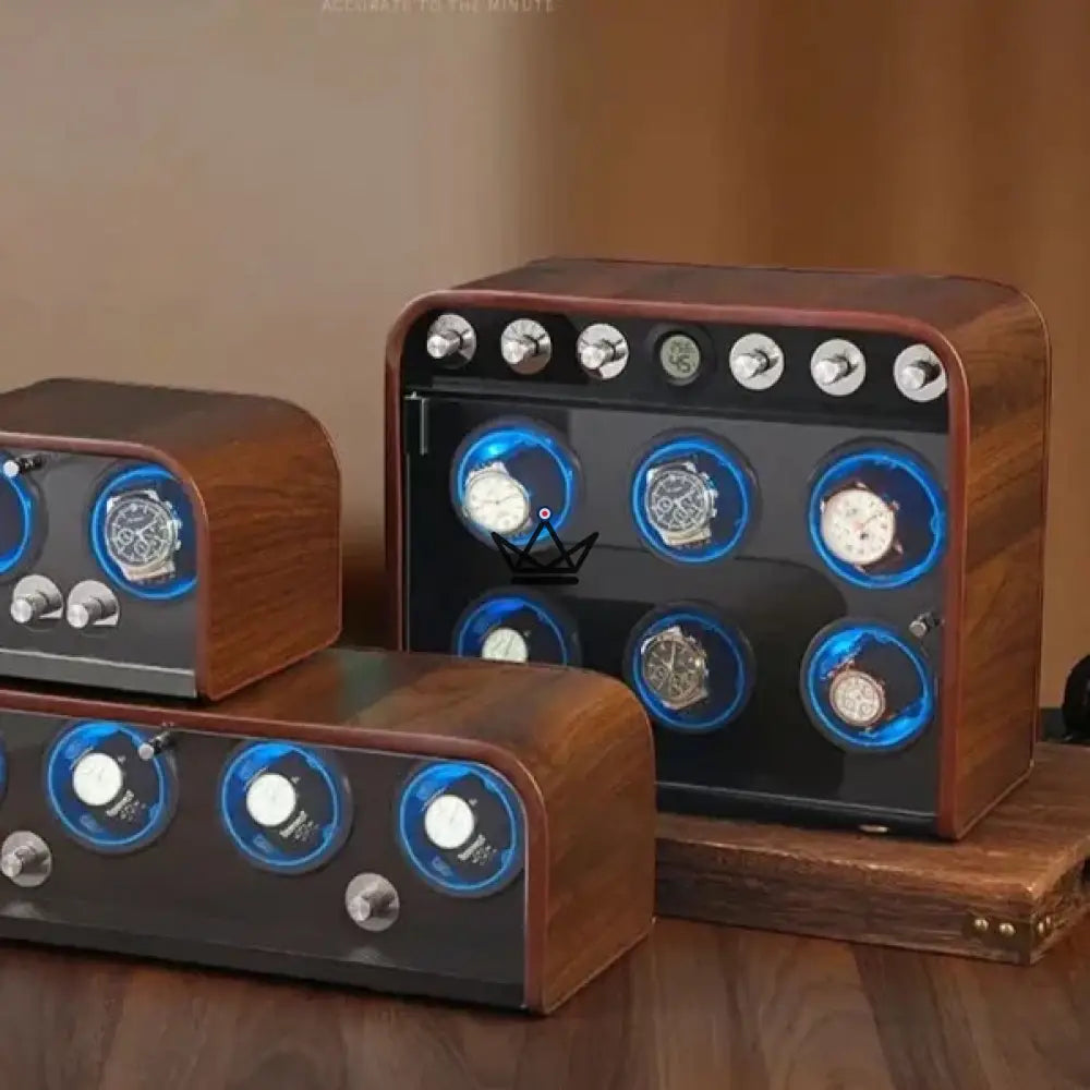 Willkommen in der Welt des Luxus und der Uhrmacherkunst, in der jedes Detail zählt. Der „Automatische Uhrenbeweger – RetroWood Luxe“ verkörpert diese perfekte Fusion zwischen der Kunst der Uhrmachermechanik und der Eleganz luxuriösen Holzdesigns. Dieses exquisite Kunstwerk soll die Präsentation und Erhaltung Ihrer Automatikuhren auf ein beispielloses Niveau heben.