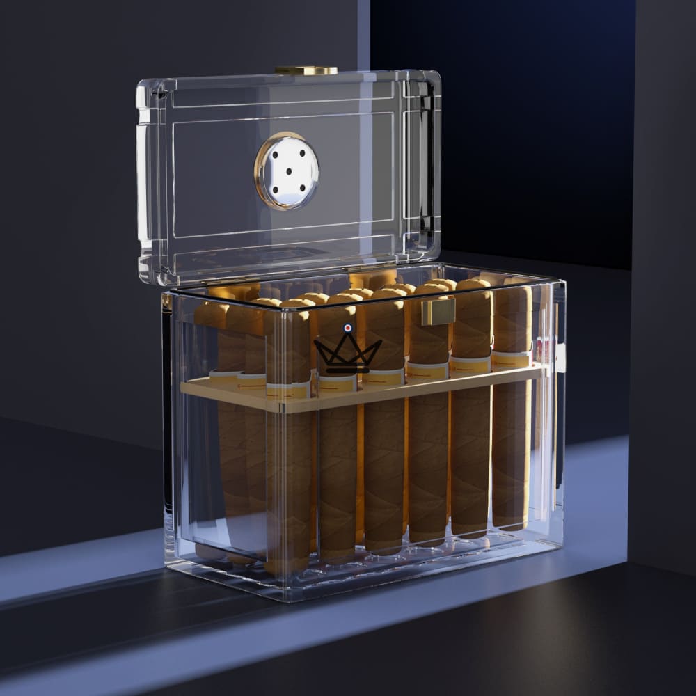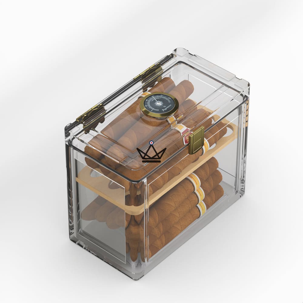 Dieser transparente Humidor hat dank seiner Acrylkonstruktion einen luftdichten Deckel, auf dem sich ein Hygrometer für eine perfekte Feuchtigkeitskontrolle befindet.