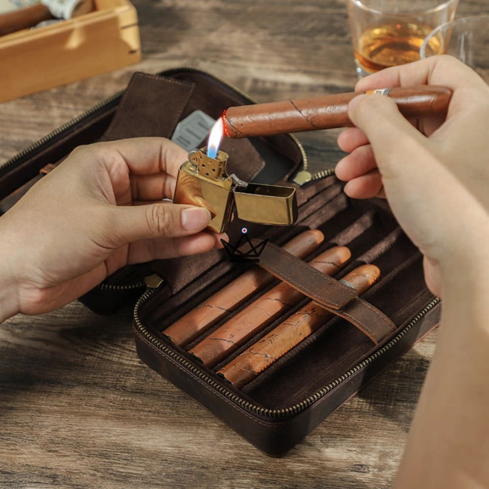 Das Zigarrenetui verfügt über einen praktischen Schlitz für ein Feuerzeug und einen Zigarrenschneider, damit Sie jederzeit zum Anzünden und Schneiden Ihrer Zigarren bereit sind.