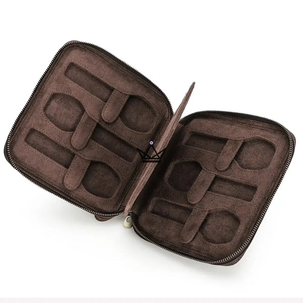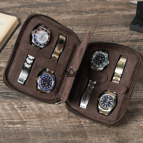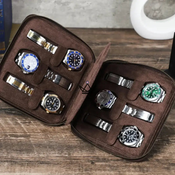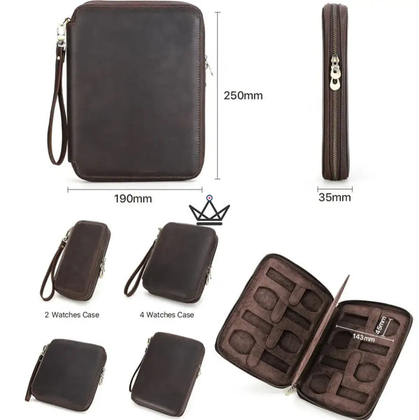 Erhältlich in vier praktischen Größen (2, 4, 6 oder 8 Uhren) , passt sie sich Ihrer Uhrensammlung und Ihren Bedürfnissen an – egal ob für einen Wochenendtrip oder eine Geschäftsreise. Dank des robusten Reißverschlusses und der abnehmbaren Handschlaufe lässt sie sich leicht tragen und liegt angenehm in der Hand.