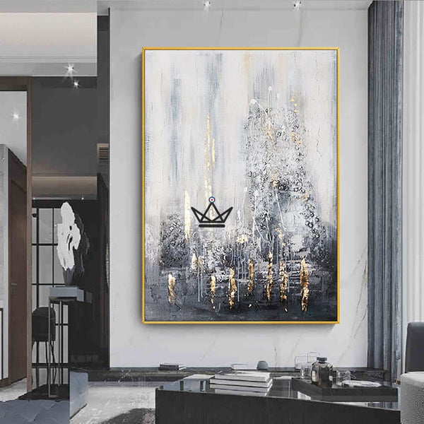 Werten Sie Ihr Interieur mit diesem handgefertigten, abstrakten, modernen Wandgemälde in Gold- und Grautönen auf. Perfekt für Ihr Wohnzimmer, Schlafzimmer oder Hotel, diese große rahmenlose XXL-Leinwand ist mit Sicherheit ein echter Hingucker.