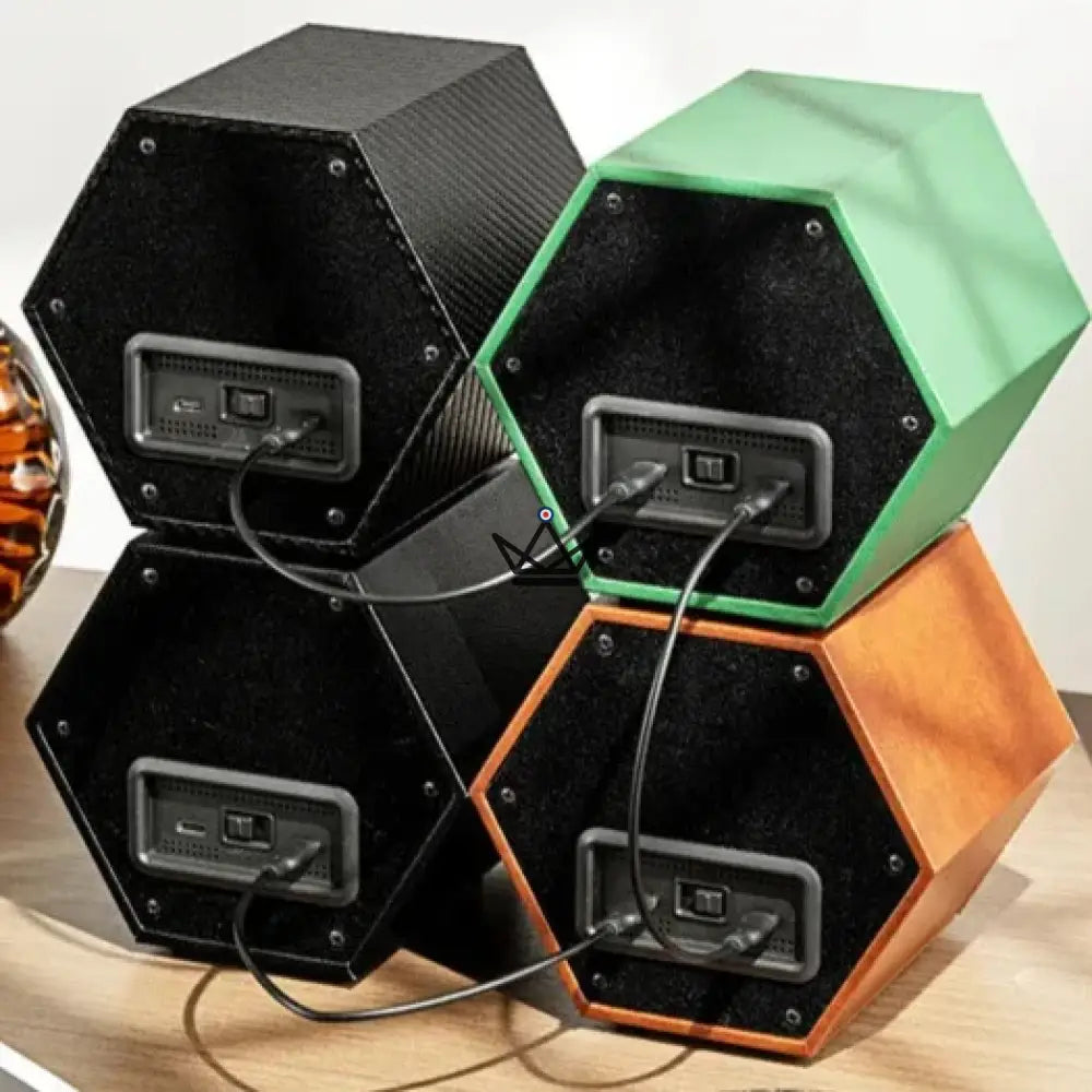 Entdecken Sie den automatischen Uhrenbeweger Jebely Hexagone, eine innovative Lösung für Uhrensammler. Dieser Uhrenbeweger zeichnet sich durch eine elegante sechseckige Struktur aus und zeichnet sich durch die Möglichkeit aus, mehrere Einheiten einfach per Kabel miteinander zu verbinden, sodass nur eine einzige Steckdose für die Stromversorgung erforderlich ist.