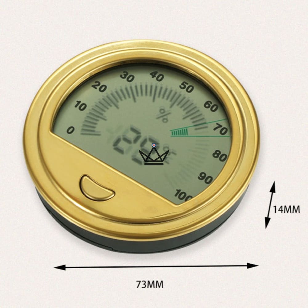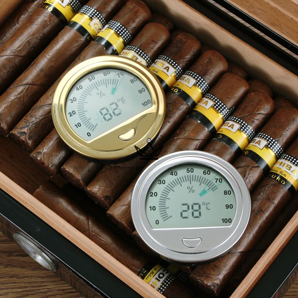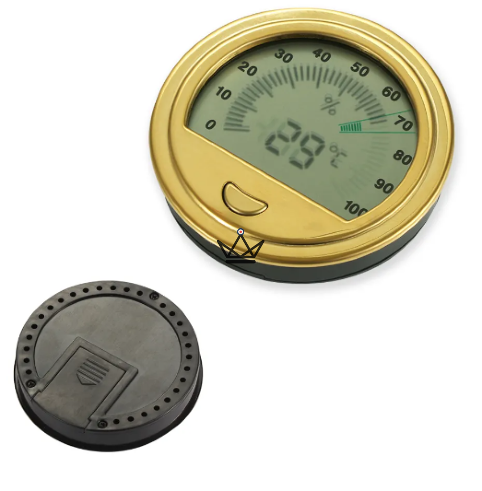 Design Élégant : Disponible en élégantes finitions or ou argent, cet hygromètre ajoute une touche de sophistication à votre collection d'accessoires pour cigares.