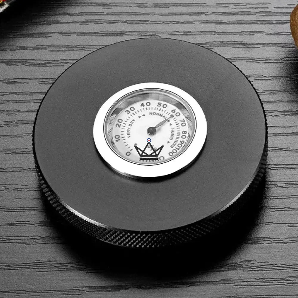 Il se recharge simplement à l’eau distillée. L’insert libère une humidité stable dans le cylindre, tandis que l’hygromètre en tête permet de vérifier la valeur (cible habituelle 65–72 % RH).