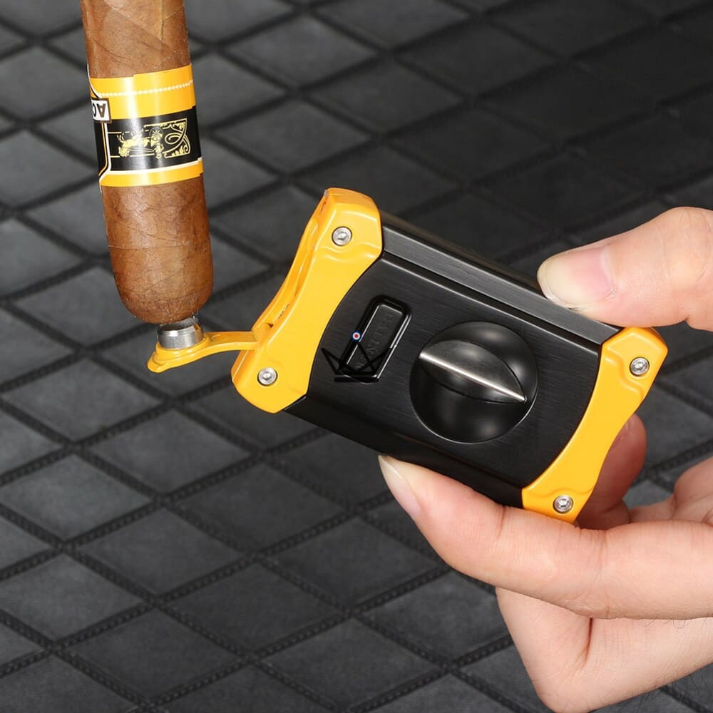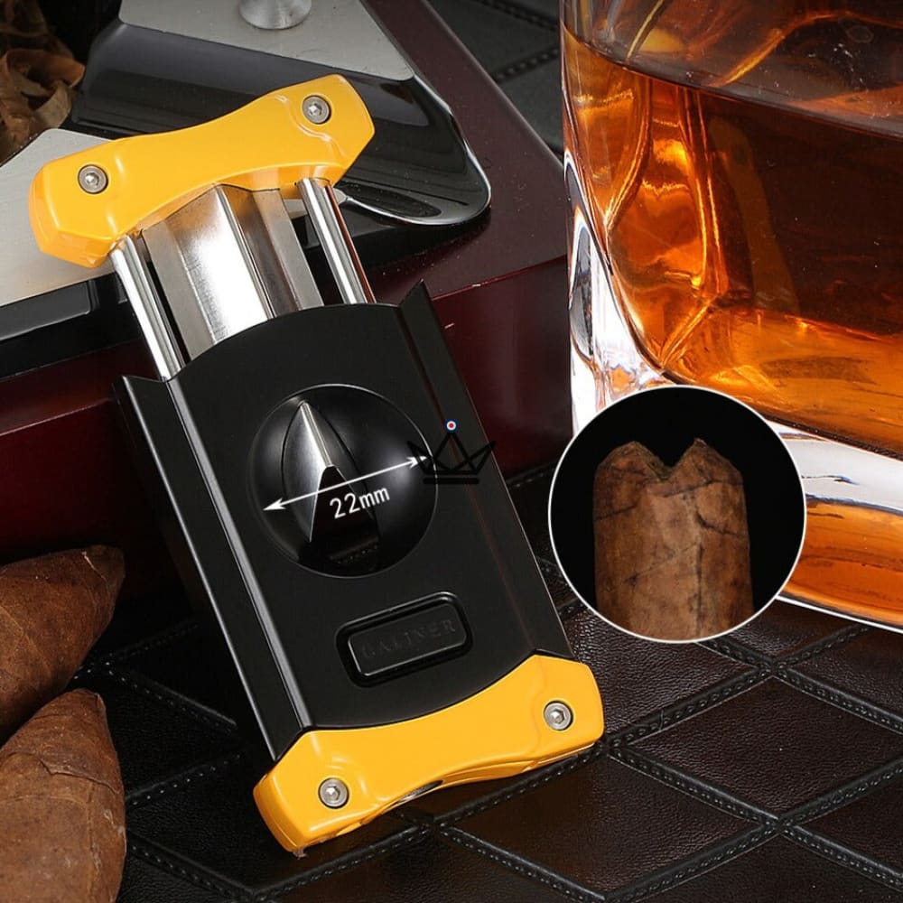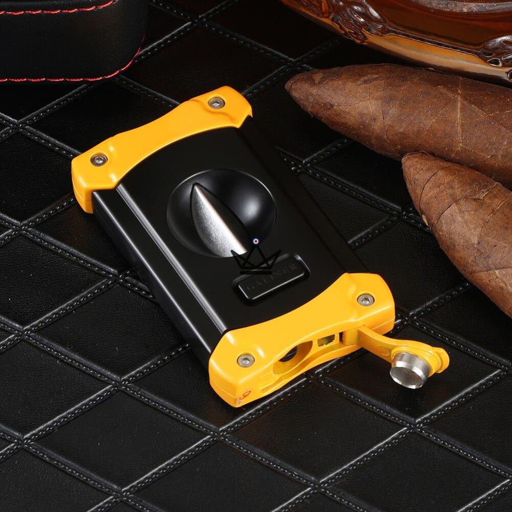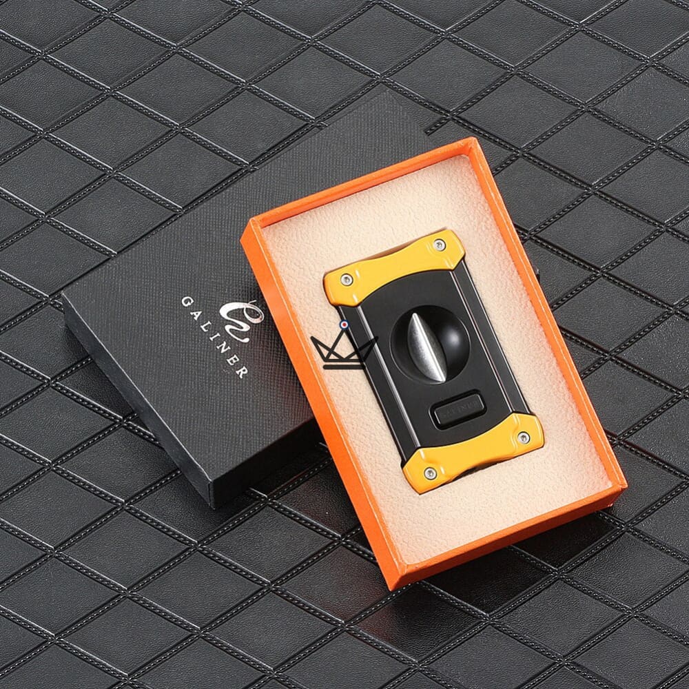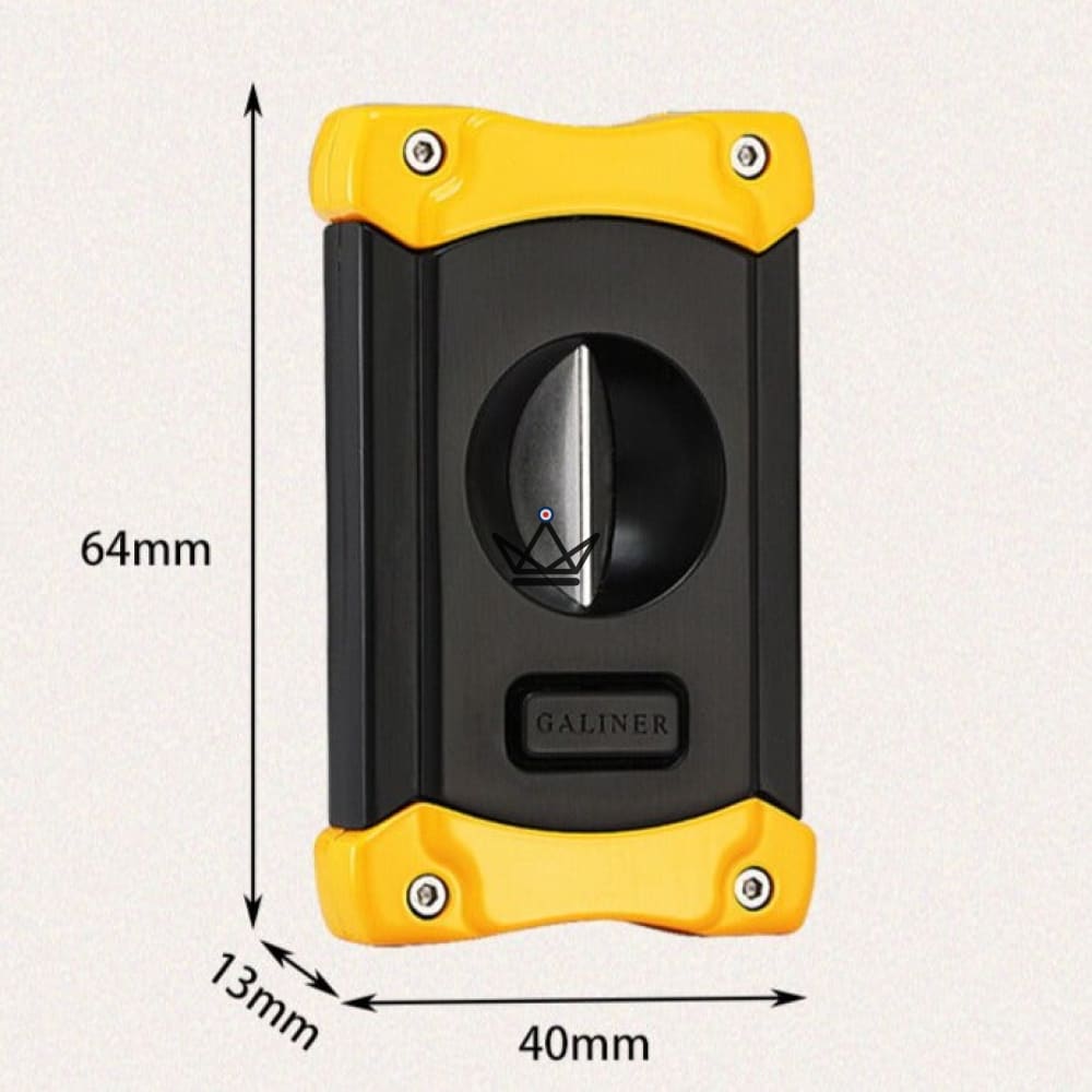 Le corps noir élégant du coupe-cigare est rehaussé par des bords en or, jaune ou rouge vif, apportant une touche de sophistication et d'élégance à votre expérience de dégustation de cigare.