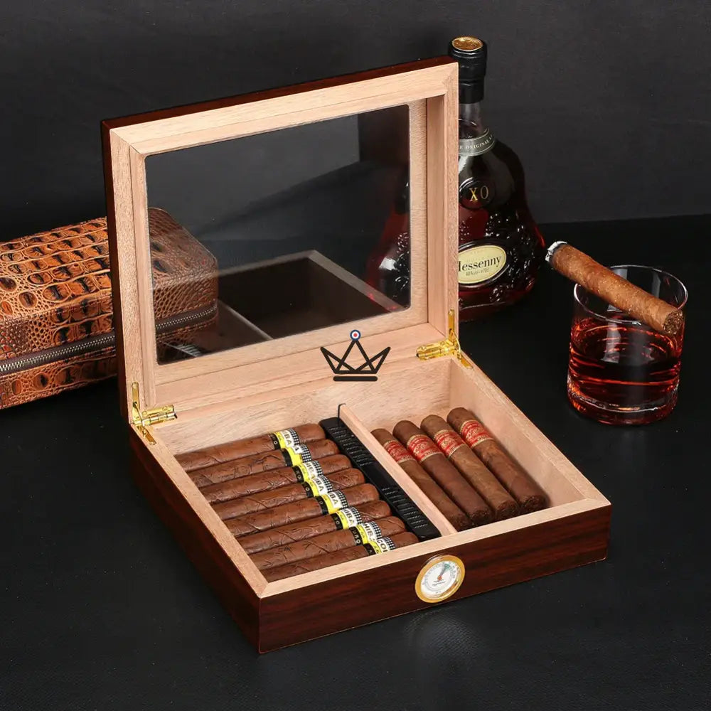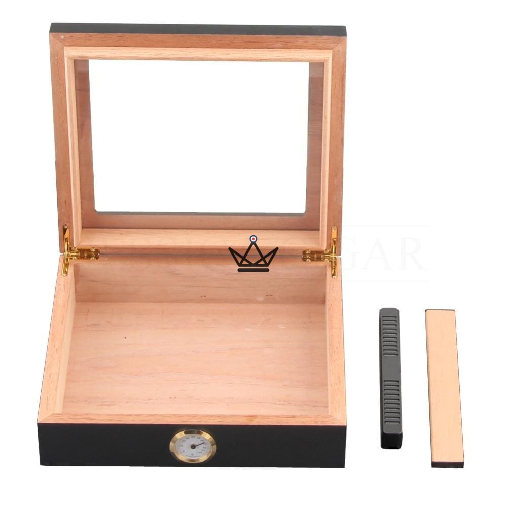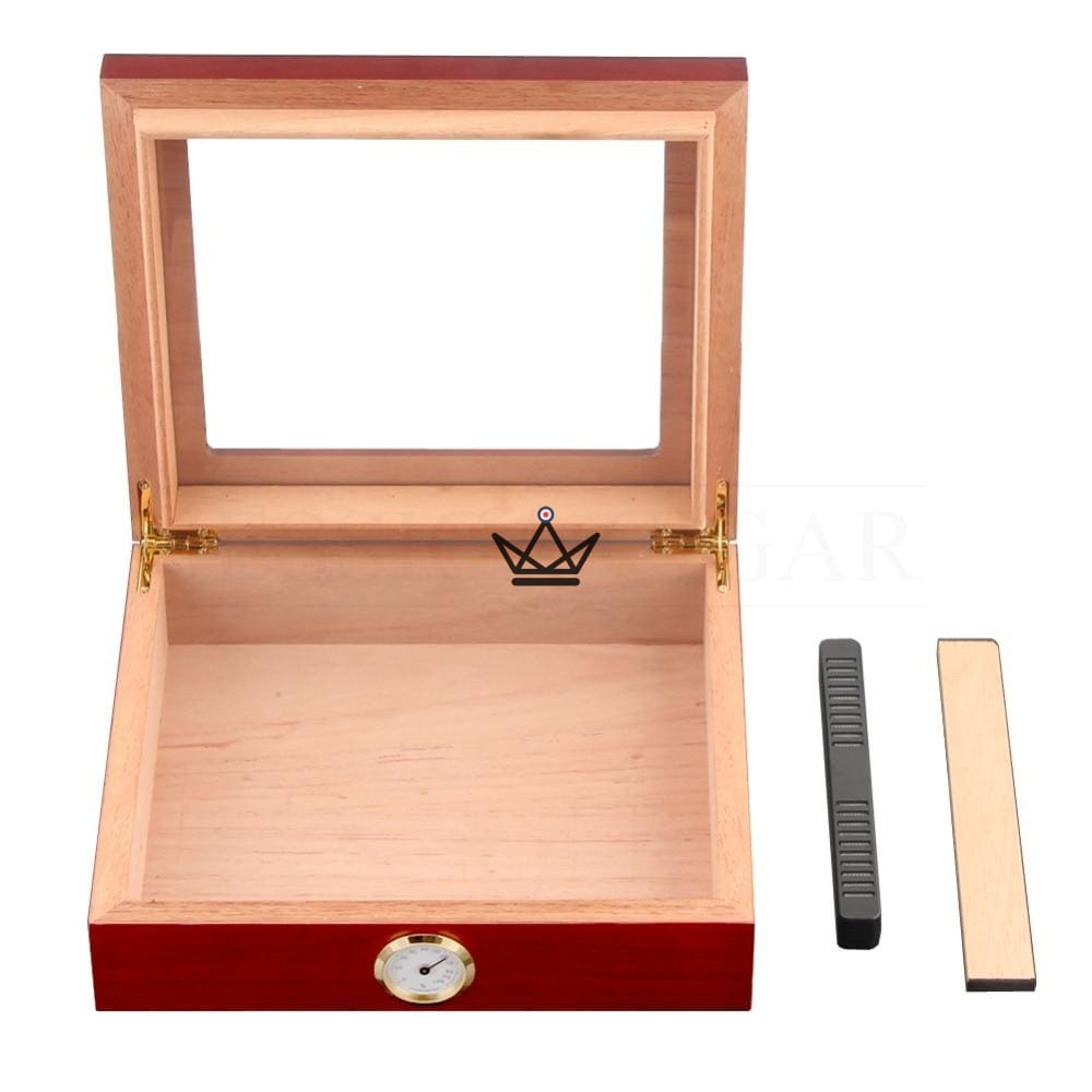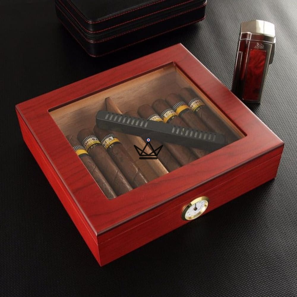 Son design contemporain, en bois de cèdre sur chacune de ses faces et une vitre sur le dessus, rend cette boite à cigares unique en son genre et originale.