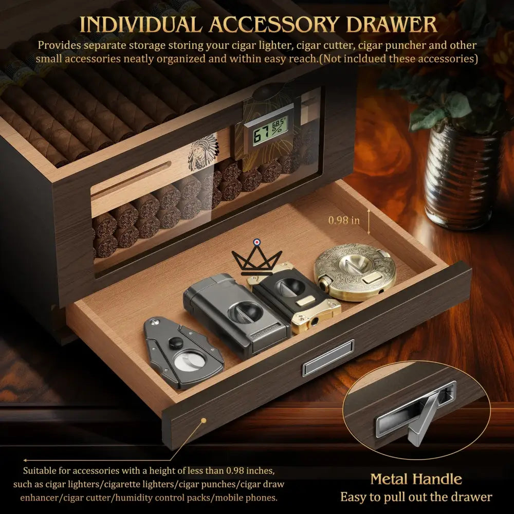 Un tiroir coulissant avec poignée métallique vous offre un espace dédié pour vos outils : coupe-cigares, briquet, poinçon ou encore sachets Boveda. Chaque élément y trouve sa place, tout en restant à portée de main.