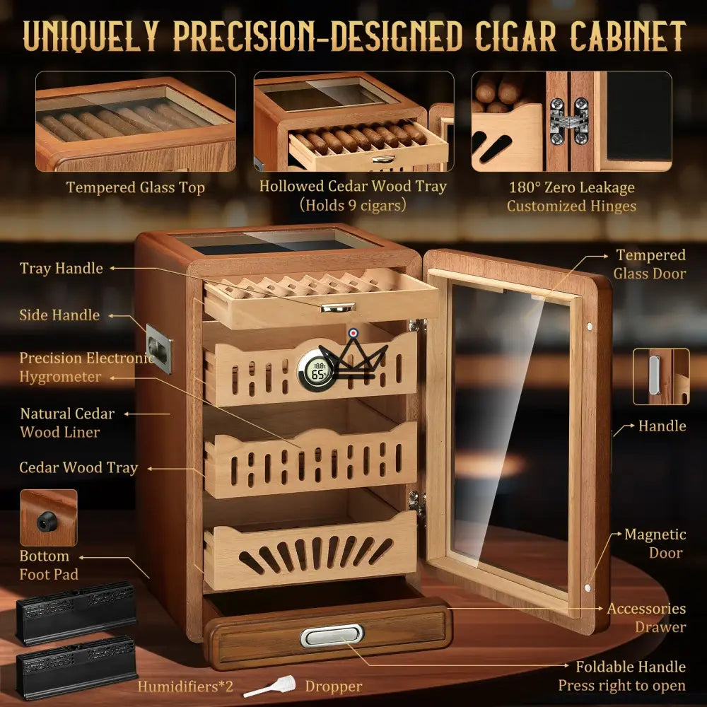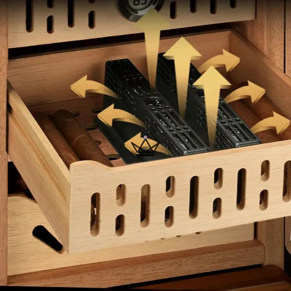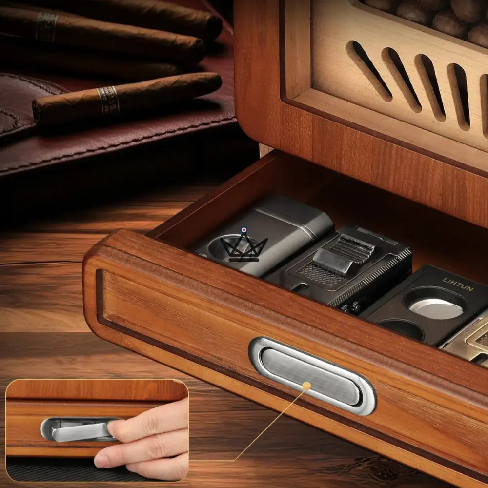 - Trois tiroirs intérieurs en cèdre naturel : Capacité totale de 100 à 150 cigares, avec une ventilation optimisée pour maintenir la fraîcheur et la saveur de vos cigares H.Upmann, Trinidad et Bolivar.
