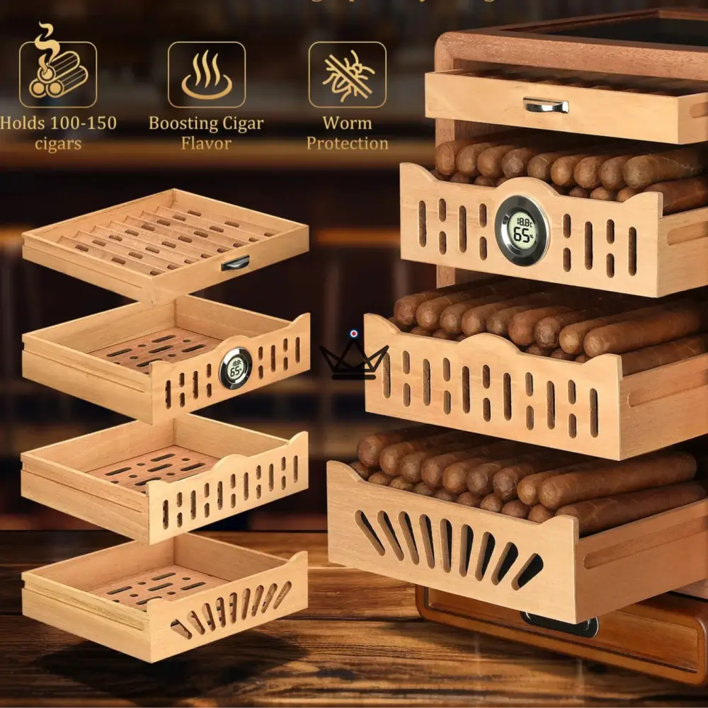 - Capacité totale : Jusqu’à 150 cigares, selon leur format