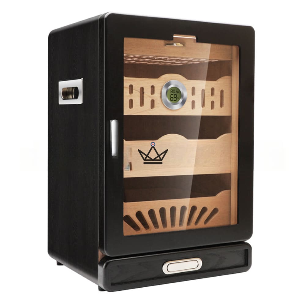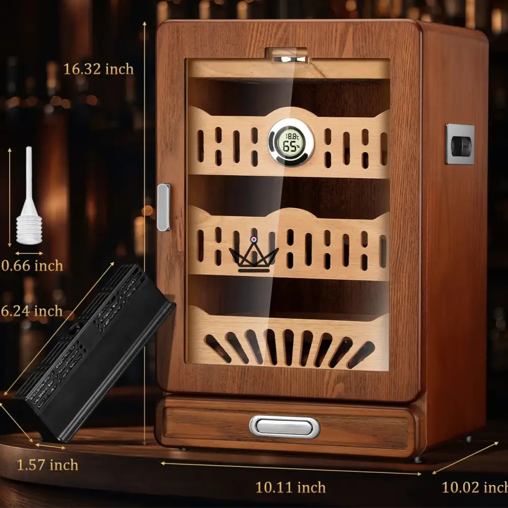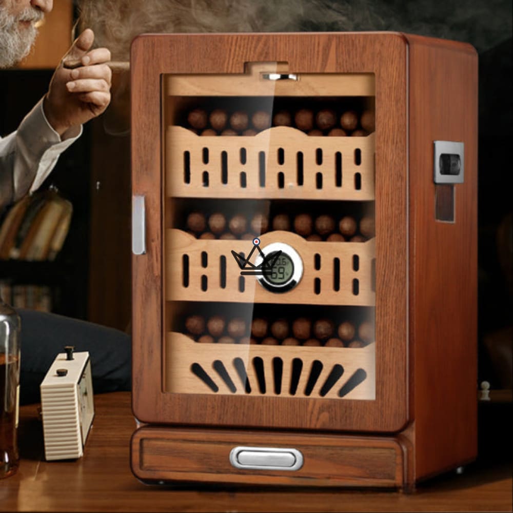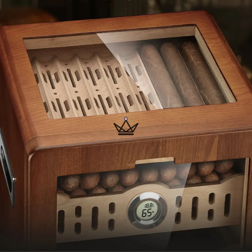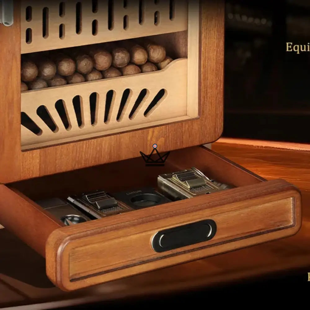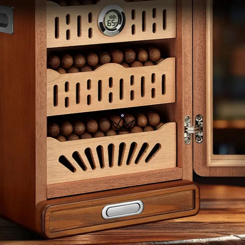 En complément, la porte vitrée en verre trempé offre une vue sur les trois tiroirs intérieurs en bois de cèdre, dont l'un est équipé d'un hygromètre électronique de précision. Cet hygromètre est stratégiquement placé pour être lisible sans avoir à ouvrir la cave, préservant ainsi l'équilibre hygrométrique idéal pour vos cigares cubains.