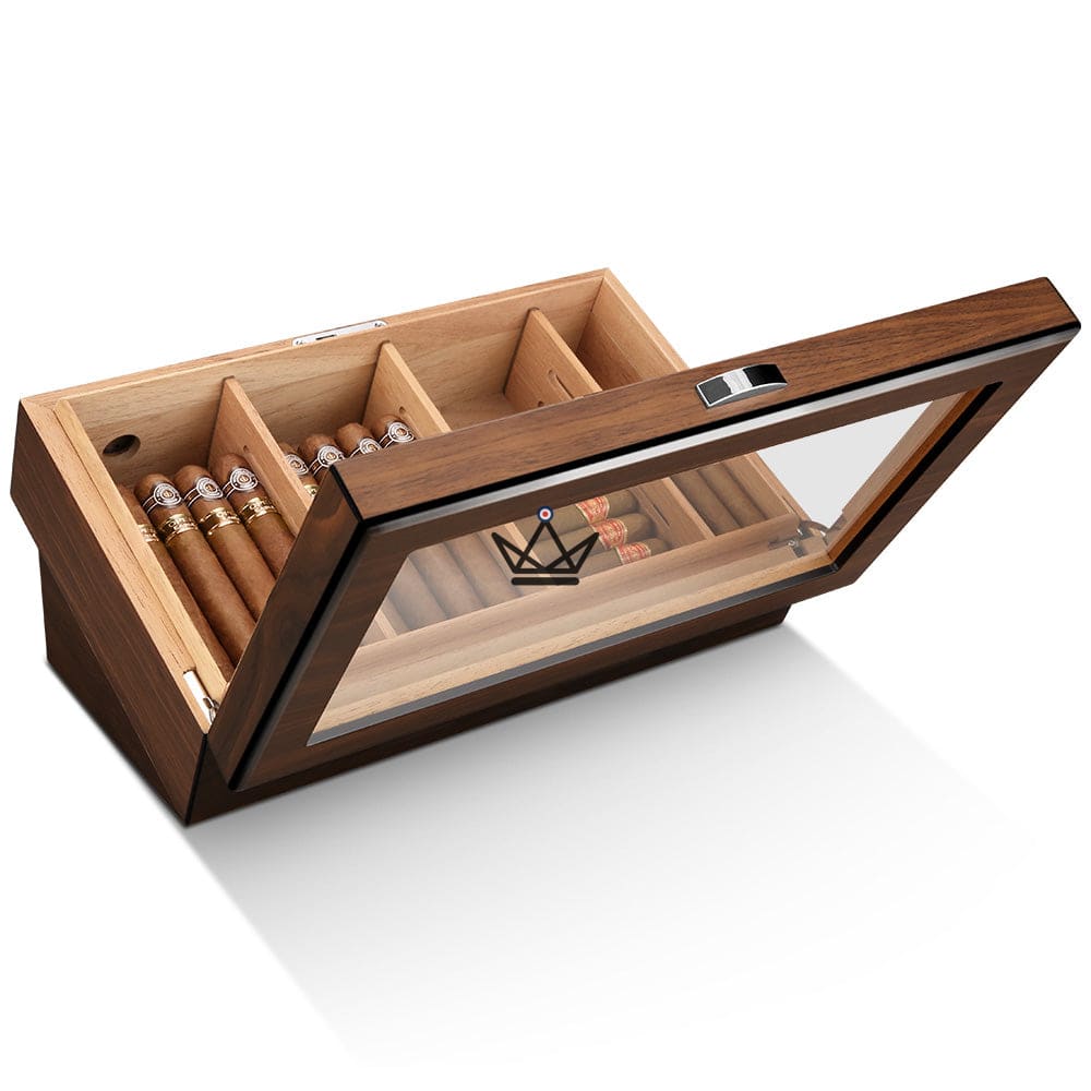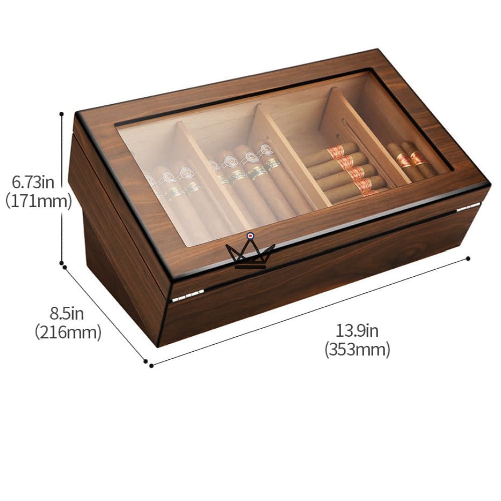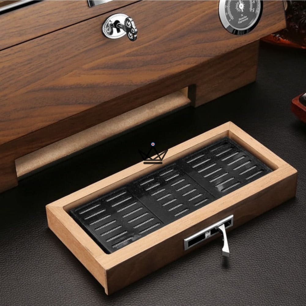Inside you will find three removable dividers that allow you to organize your cigars according to your preferences. You will be able to easily access each cigar without disturbing the rest of the collection. Additionally, the clever drawer at the base of the humidor houses the humidifier, providing convenient access and maintenance to maintain the ideal humidity.