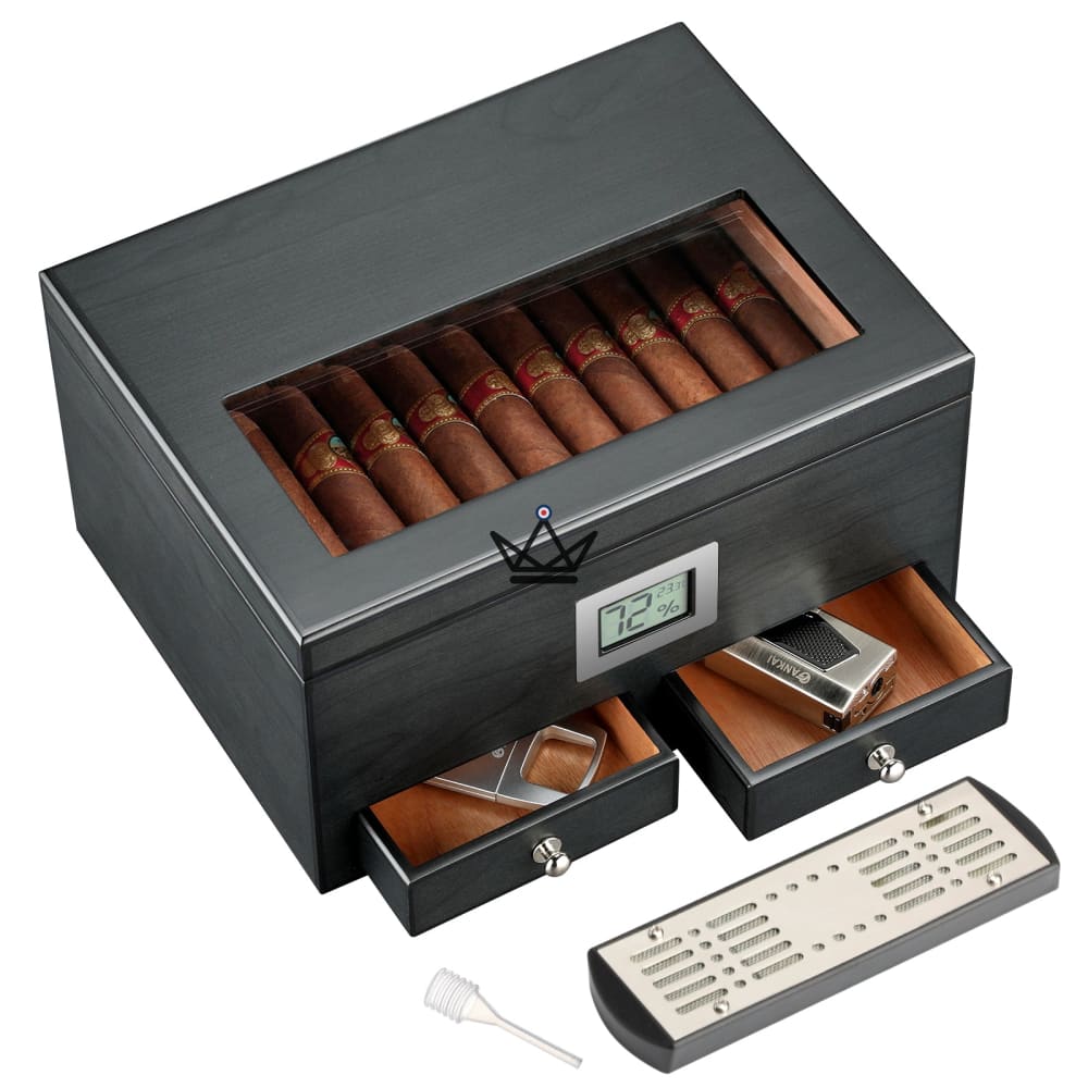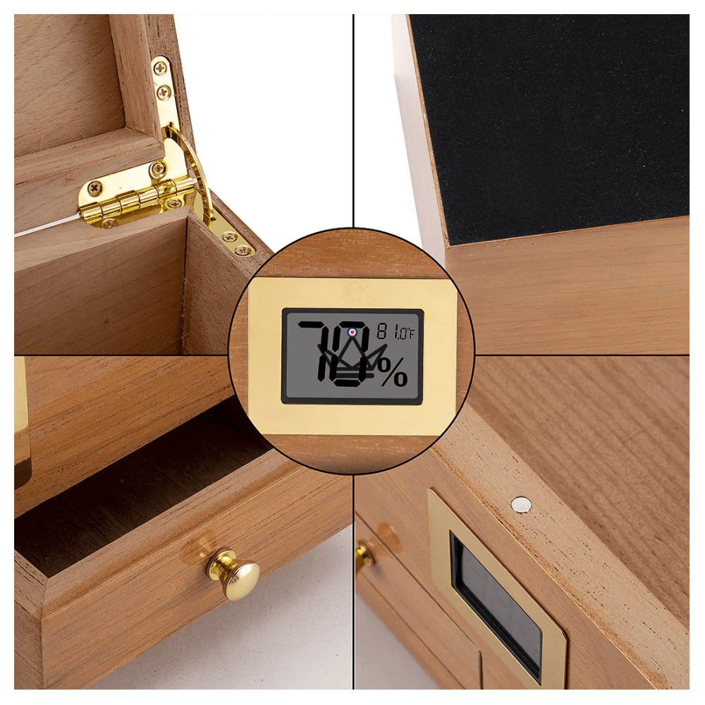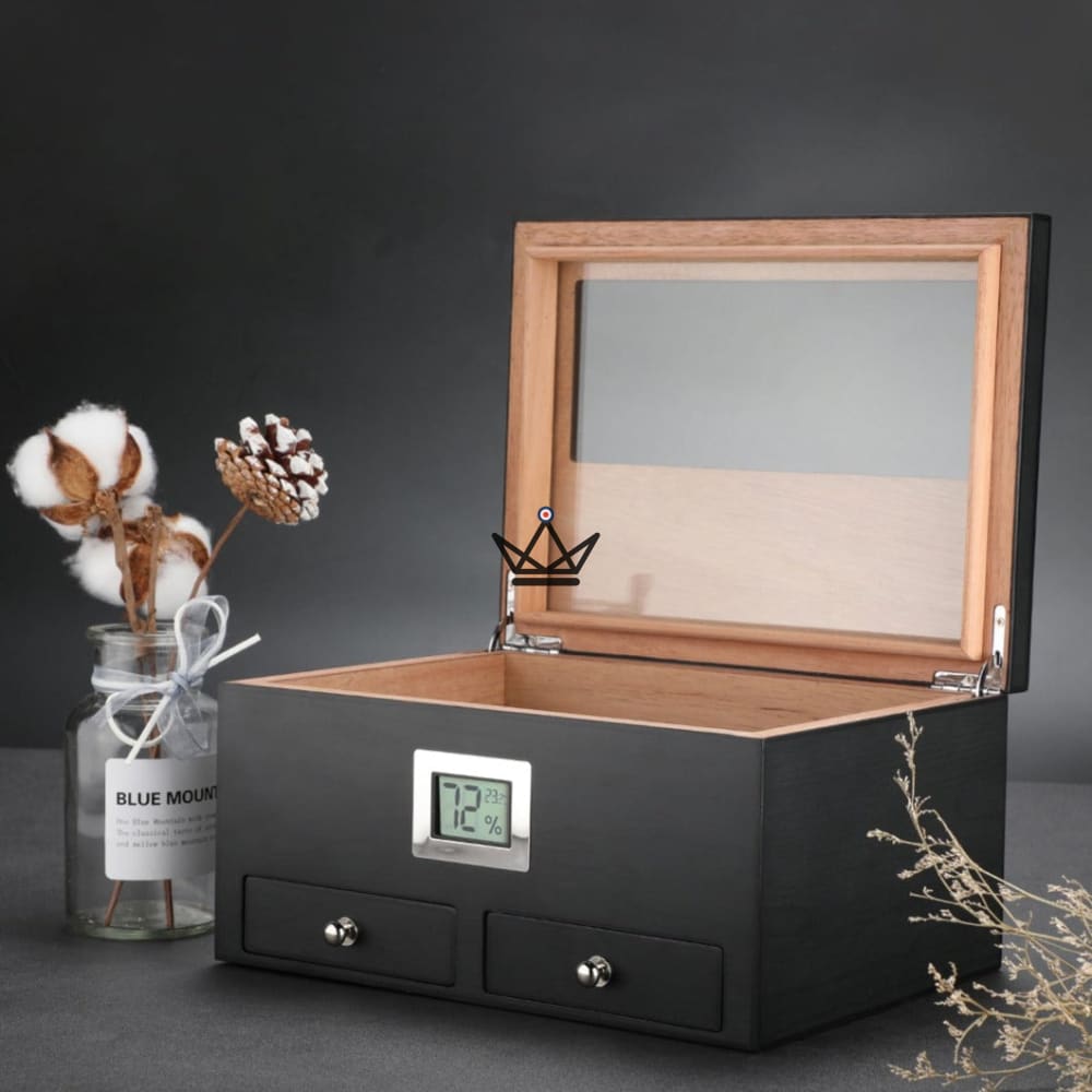 Its digital hygrometer on the front gives you an ultra-precise humidity level without having to open your cellar. To maintain this humidity, so precious to cigars, a crystal humidifier is included. Your cigars will then be perfectly preserved thanks to these accessories and the cedar wood inside.