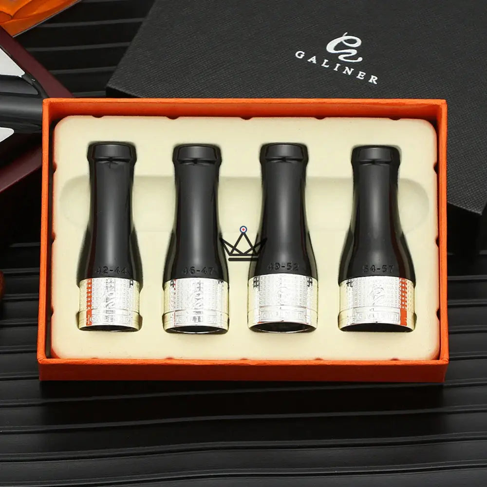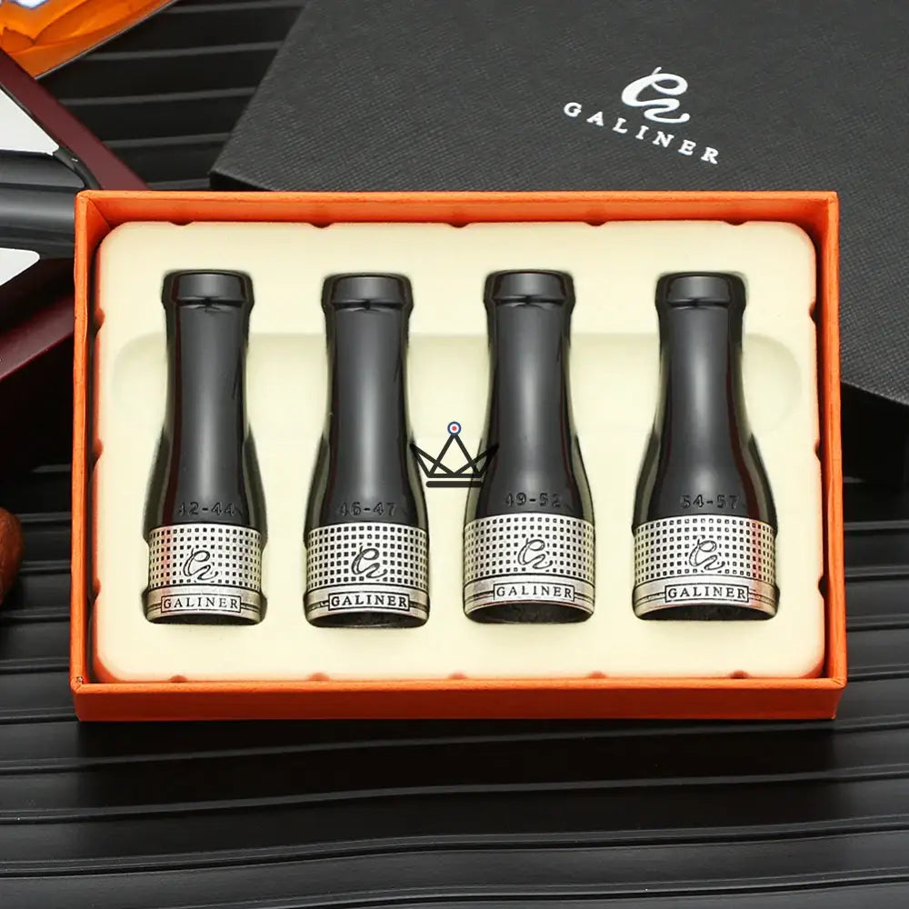 With Aristocap, transcend the pleasures of cigars thanks to an assortment of tips that are as functional as they are refined. Each set is comprised of four distinct sizes – 42/44, 46/47, 49/52, 54/57 – designed to fit the full range of Cohiba and other cigar rings, ensuring a personalized and comfortable experience for every enthusiast.